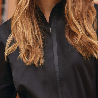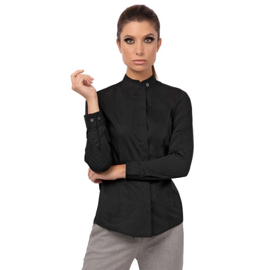 商品の特徴 ポリエステル64%/綿34%/ポリウレタン2% 生地 3.8 oz. 長袖 バンドカラー(ボタン留めタブ付) 比翼仕立て 袖口幅を調節可能なカフス バックヨーク ダブルステッチ縫製 前後身頃プリンセスライン切り替え カラー:ブラック(全2色あり) メンズあり(アイテムコード:...