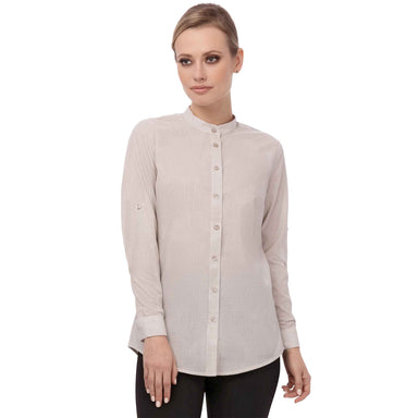 商品の特徴 綿62%/ポリエステル38% 生地 2.6 oz. ヘアラインストライプ 長袖 バンドカラー 首後ろにエプロンホルダー 袖口幅を調節可能なカフス 袖ロールアップ留め用ボタン付きタブ プリーツ付きバックヨーク カラー:ナチュラル(全3色あり) レディースあり(アイテムコード:SF...