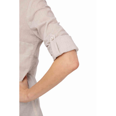商品の特徴 綿62%/ポリエステル38% 生地 2.6 oz. ヘアラインストライプ 長袖 バンドカラー 首後ろにエプロンホルダー 袖口幅を調節可能なカフス 袖ロールアップ留め用ボタン付きタブ フロントダーツ カラー:ナチュラル(全3色あり) メンズあり(アイテムコード:SFB02) ...