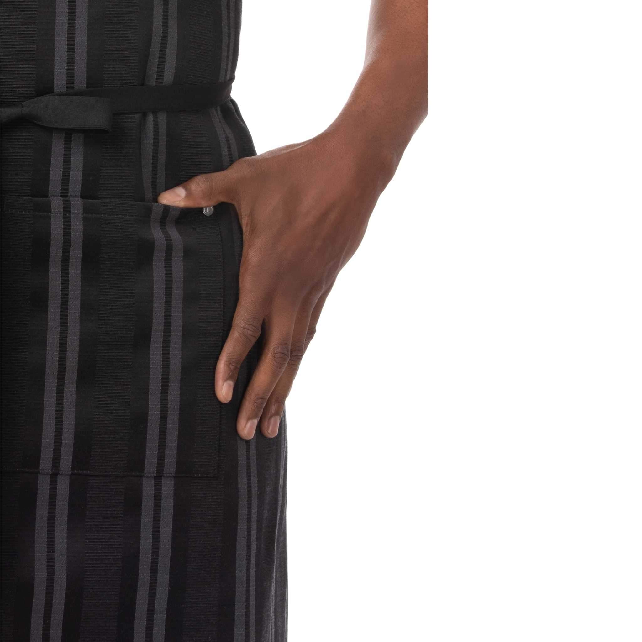 Chef Works人気のアーバンコレクションの1つ、プレシディオビブエプロンは綿とポリエステルの混紡生地でできたストライプのエプロン。白地のコックコートやTシャツとの組み合わせによく映えます。調節可能な肩紐とジーンズのようなリベット留めの2つの前ポケット。シンプルかっこいいエプロンです。