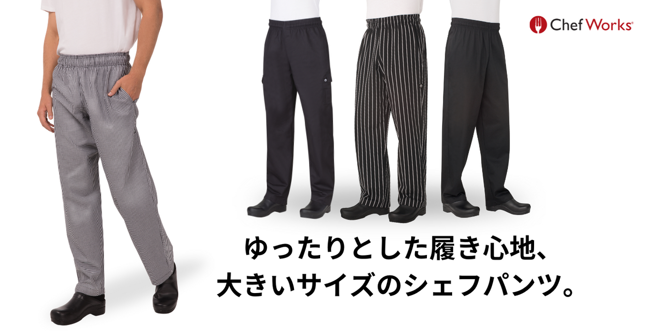 リラックスしたフィット感が特徴のChef Worksのパンツ類、ベルトループが付いたスラックスタイプの上品なパンツから、ウエスト周りをゴムと内紐で調節ができる快適なパンツまで複数のスタイルをご用意しています。無地やストライプ、カーゴパンツ等、ご自身の好みにあったスタイルを見つけてください。Chef Worksのシェフパンツは、耐久性に優れるしっかりとした生地感とゆったりとした履き心地で、飲食店でのハードワークを支えます。