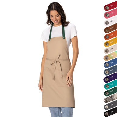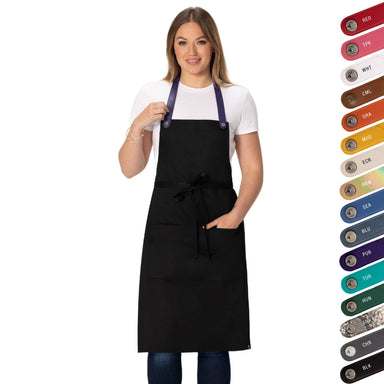 定番のエプロンを自分好みにカスタマイズ!クラシックなスタイルとお手頃価格で圧倒的な販売数を誇る定番のエプロンに、レザールックストラップ式が登場。重厚感のあるレザールックストラップで好みのカラーコンビネーションにカスタマイズすれば、店舗の雰囲気を一層引き立てるエプロンが完成します。ストラップはスナップボタン式で強度があり、着脱もとっても簡単。エプロン本体は、通常版で実績を積んできたしっかりとした厚みの6.2oz.ポリコットンを採用。毎日の使用・洗濯に耐える耐久性を有しています。前面には仕切り付きのポケットを備え、オーダー用タブレットも携帯可能。無地なので自由に刺繍を施してカスタマイズする事も可能。レストランやカフェ、居酒屋などの飲食店はもちろん、お花屋さんから床屋さんに至るまで、使う場所を選ばないシンプルで使い勝手の良いエプロン。豊富なカラーバリエーションからお気に入りのコンビネーションを見つけてください。