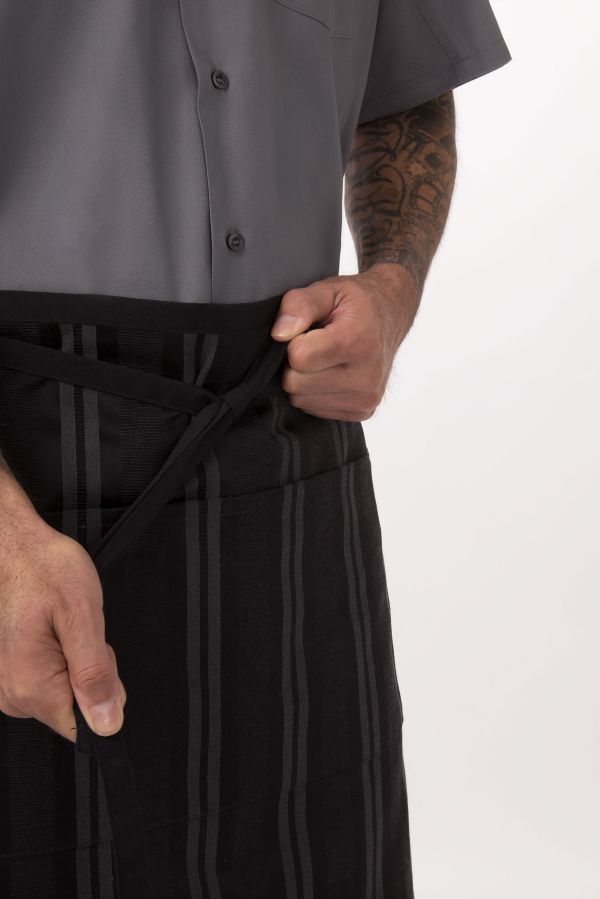 Chef Works人気のアーバンコレクションの1つ、プレシディオハーフエプロンは綿とポリエステルの混紡生地でできたストライプのエプロン。白地のコックコートやTシャツとの組み合わせによく映えます。混紡なので、生地は丈夫、着心地よく、乾きも早い。ジーンズのようなリベット留めの2つの前ポケットはipad2も入る大きさ。色のコントラストが綺麗なシンプルかっこいいエプロンです。#Presidio #ぷれしでぃお #エプロン黒