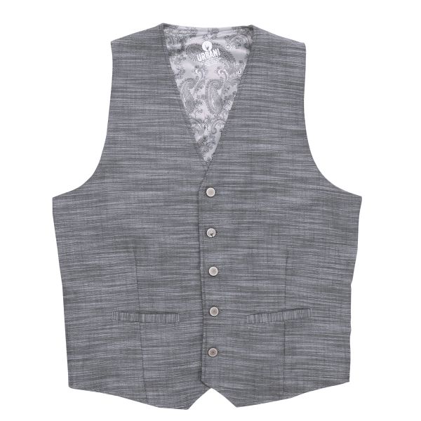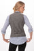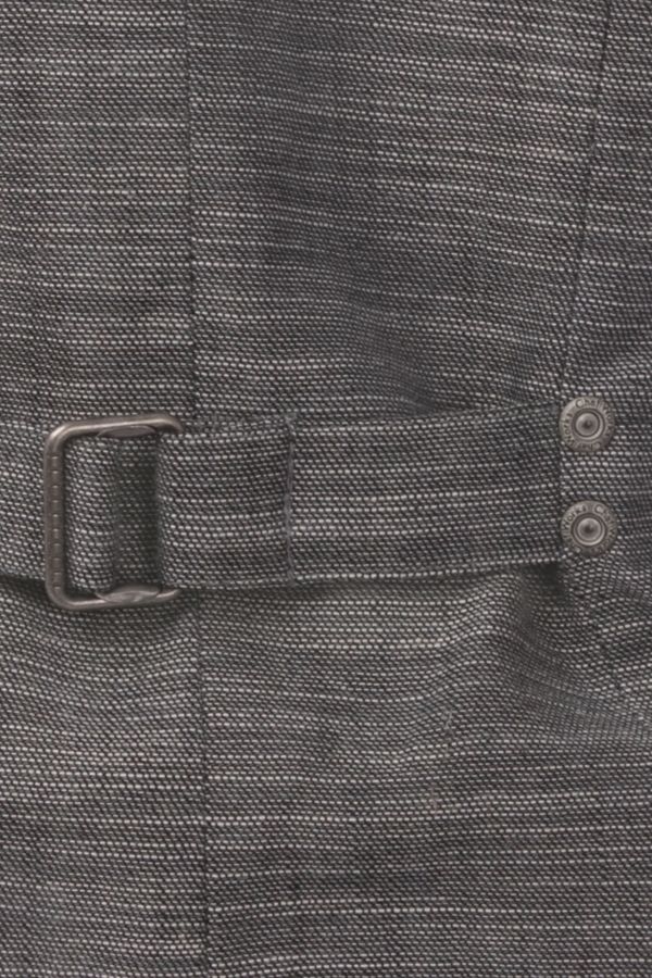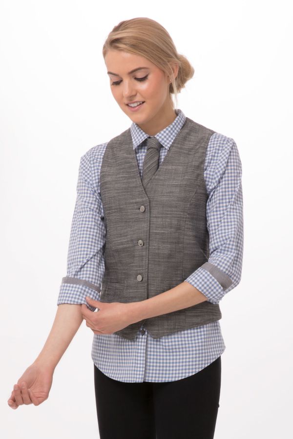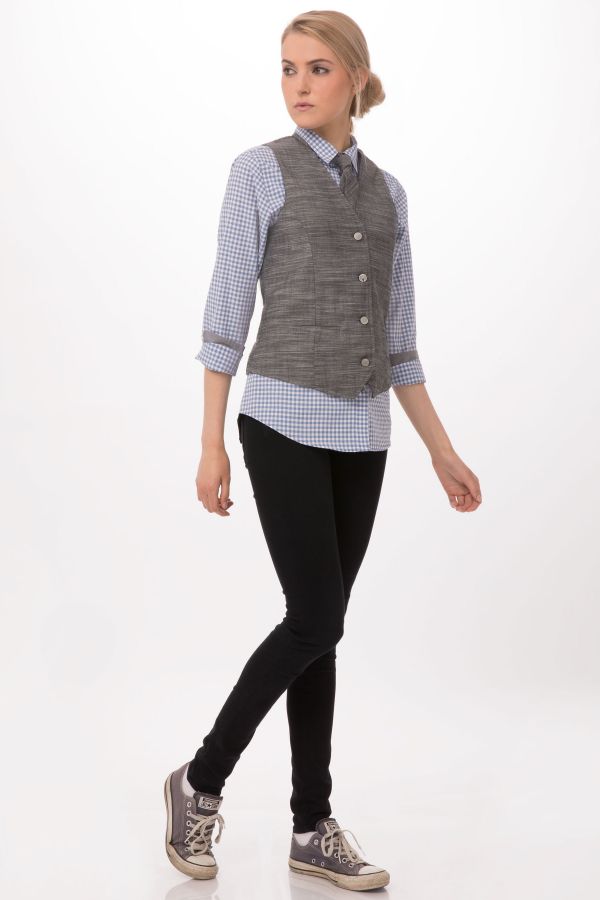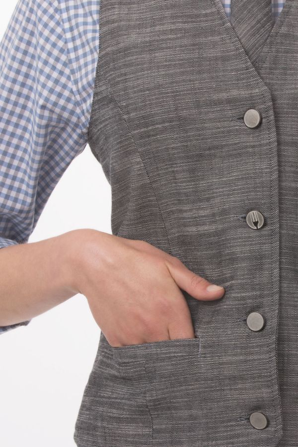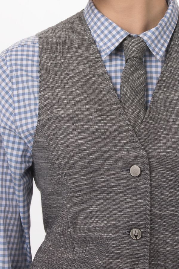 より体のラインに沿うような形に仕上げたファイヤーフォックスベスト。ウエストのゆるみを調節するベルト付き。箱ポケット2つ。裏地にペイズリー模様を施しています。2つ目のボタンにChef Works のロゴマーク入り。