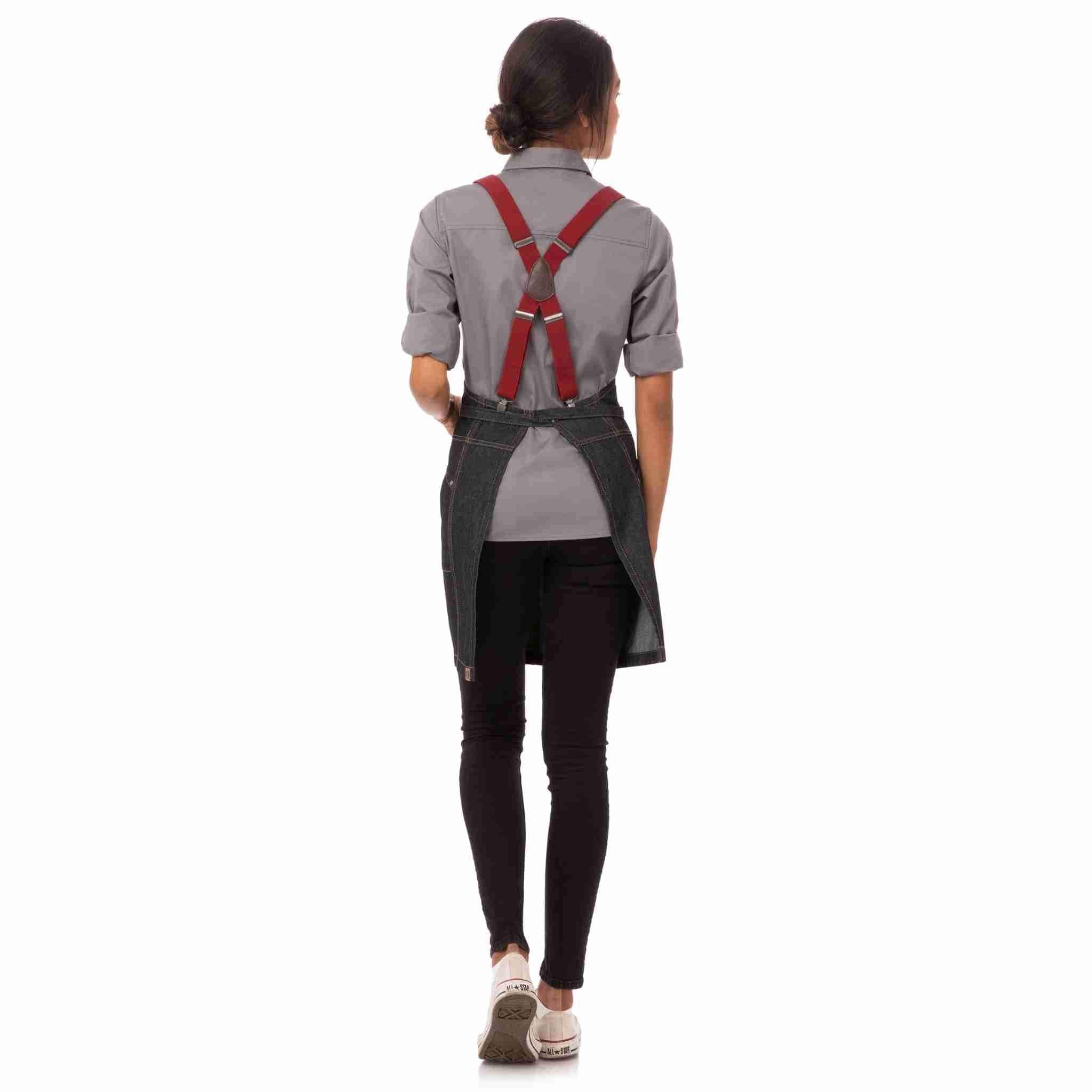 サスペンダータイプのショルダーストラップを採用したエプロン界の革命児「バークレーエプロン」にスナップボタン式が登場。アンティーク加工の施されたスナップボタン式のサスペンダーは丈夫で着脱もとっても簡単。サスペンダーは着用する方の好みや店舗のコンセプトに合わせて全4色からお好きな色を選択可能。サスペンダーは4カ所で長さ調節が可能、背中で交差するクロスバックタイプで首への負担が少なく、長時間の仕事も快適にこなせます。サスペンダーのストラップ部分には伸縮性のある素材を採用し体へのフィット感がアップ、エプロンが安定しより快適な着心地に。エプロン本体は綿100%の軽量デニム生地を採用、キッチンやフロアでのハードワークにも耐えるしっかりとした質感に。また使い込むほどにジーンズの様な経年変化が楽しめる点も魅力。エプロン前面には大きめのポケットを2つ備え、それぞれのポケットにはペン用のディバイダ―付き。右胸にはスリムなポケットとその中にペン・小物挿し付き。スモールサイズは小柄な方でもすっきりと着こなせる短めの丈感が特徴。サスペンダーを採用したスタイリッシュな見た目と圧倒的な快適性を「バークレー」エプロンで手に入れましょう!