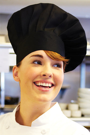 ポリエステルと綿の混紡でできた着け心地よいベレータイプのシェフハット。後ろに調節可能なマジックテープ付き。カラーはホワイトもあり。