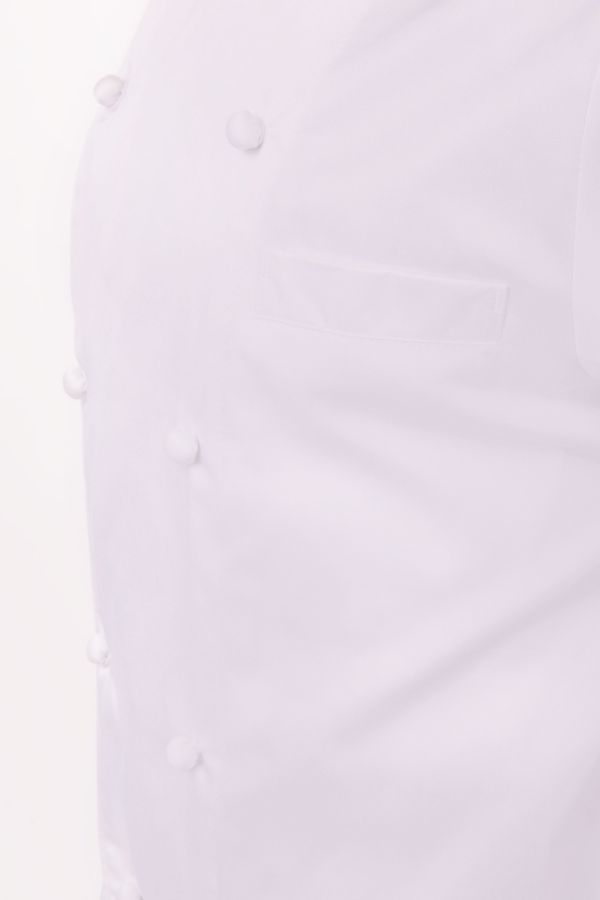 カプリプレミアムコットンシェフコートは、軽量タイプの耐久性に富んだエジプトコットン100%の半袖。左胸ポケットに加えて、左腕にペン・温度計用ポケットあり。左胸ポケットは縫い目が前から見えないように縫われており、外観がよりシンプルに、また手くるみボタンで上質感プラス。裏地には2つのスナップボタン付き。肌触りの良さはやっぱりナチュラル素材のプレミアム綿100%。ゆったりめに着れるフィット感ある、プレミアムユニフォームです。13サイズ展開あり。ホワイトのみ。
