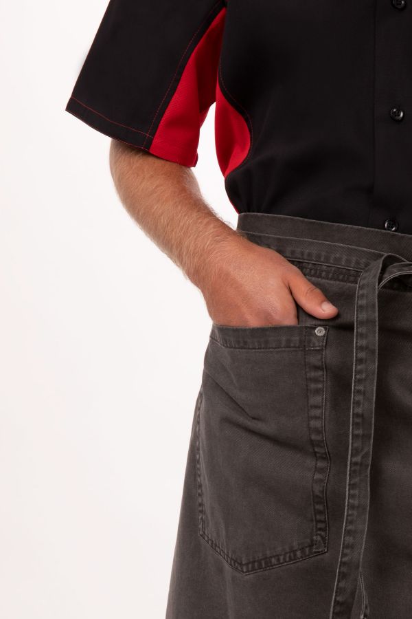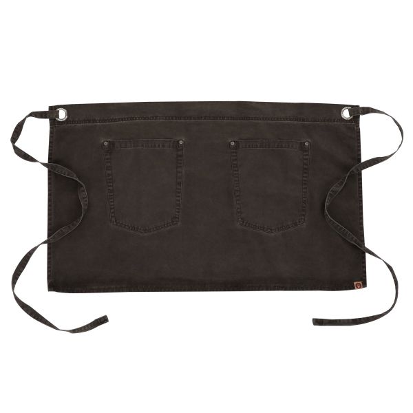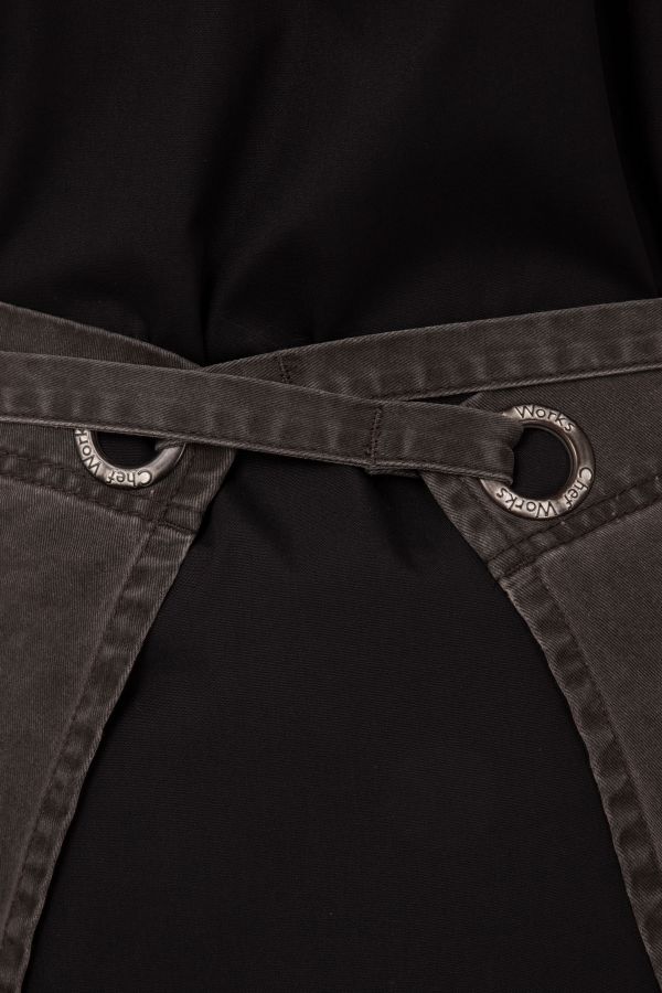 Chef Works人気のアーバンコレクションの1つ、ドーセットハーフエプロンは綿100%。ヴィンテージウォッシュ加工、腰紐の金具でヴィンテージ感を出しました。使えば使うほど、洗えば洗うほど味が出てくるエプロンです。大きめ2つのポケットもジーンズのような金具のリベット留めがしてあり、こだわりのエプロンです。