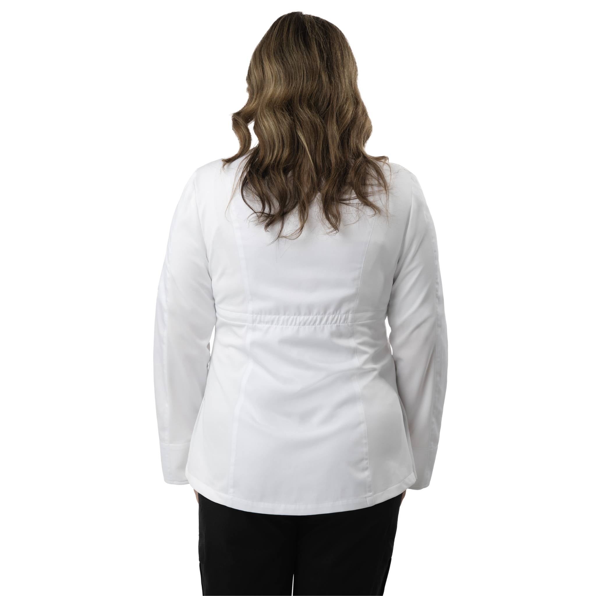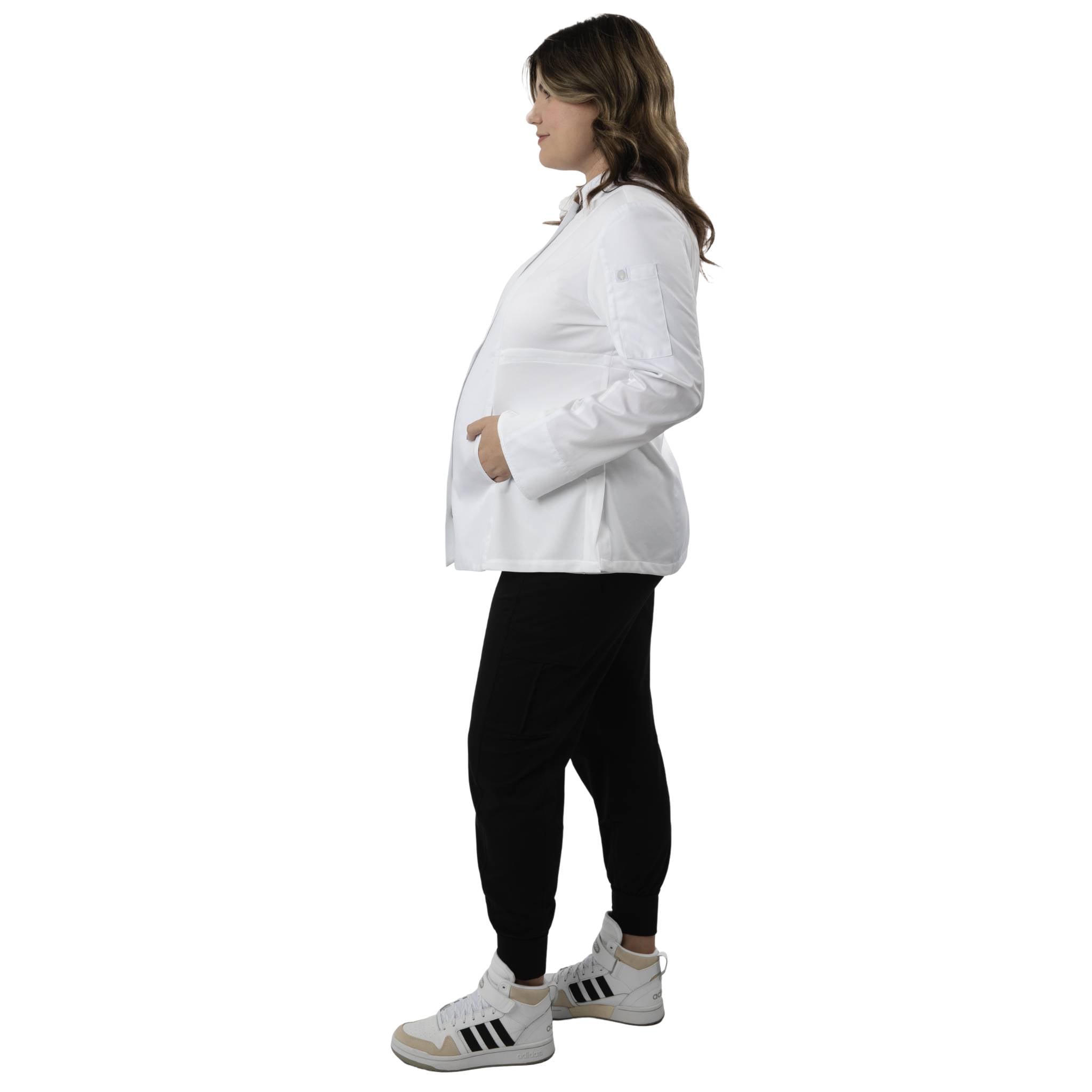 妊娠中もキッチンで活躍する世界中の女性シェフをサポートすべく、Chef Worksから「マタニティコックコート」が誕生しました。おなかをゆったりと包み込む特別なパターンを採用したマタニティコックコートは、スリーブ内側とボディー両サイドのパネルに伸縮性と通気性に優れる生地を採用し、極限まで着心地の良さを追求しています。また、妊娠のステージに合わせてウエストの絞り具合を調節できるアジャスター付きのゴムコードをジャケット内側のバスト下の位置に搭載しています。バスト下を絞る事でおなかにストレスをかけずめりはりのある着こなしをする事も可能です。ジャケットの前開きには上下両方の解放が可能な2WAYジッパーを採用し、着心地の調節とスムーズな着替えを可能にしています。ボディー両サイドに施された通常よりも深めのスリットもマタニティコックコートの着心地を高めるポイントです。左腕にはペン・温度計挿しポケットを搭載し、コックコートとしての機能性もしっかりと備えています。妊娠中のシェフご自身に、妊娠中の大切な同僚に、「マタニティコックコート」の導入を是非ご検討ください。