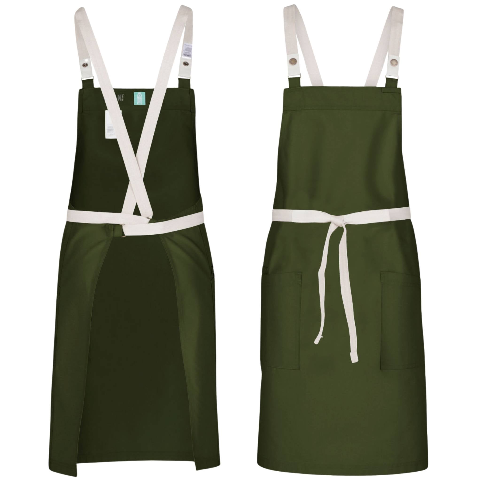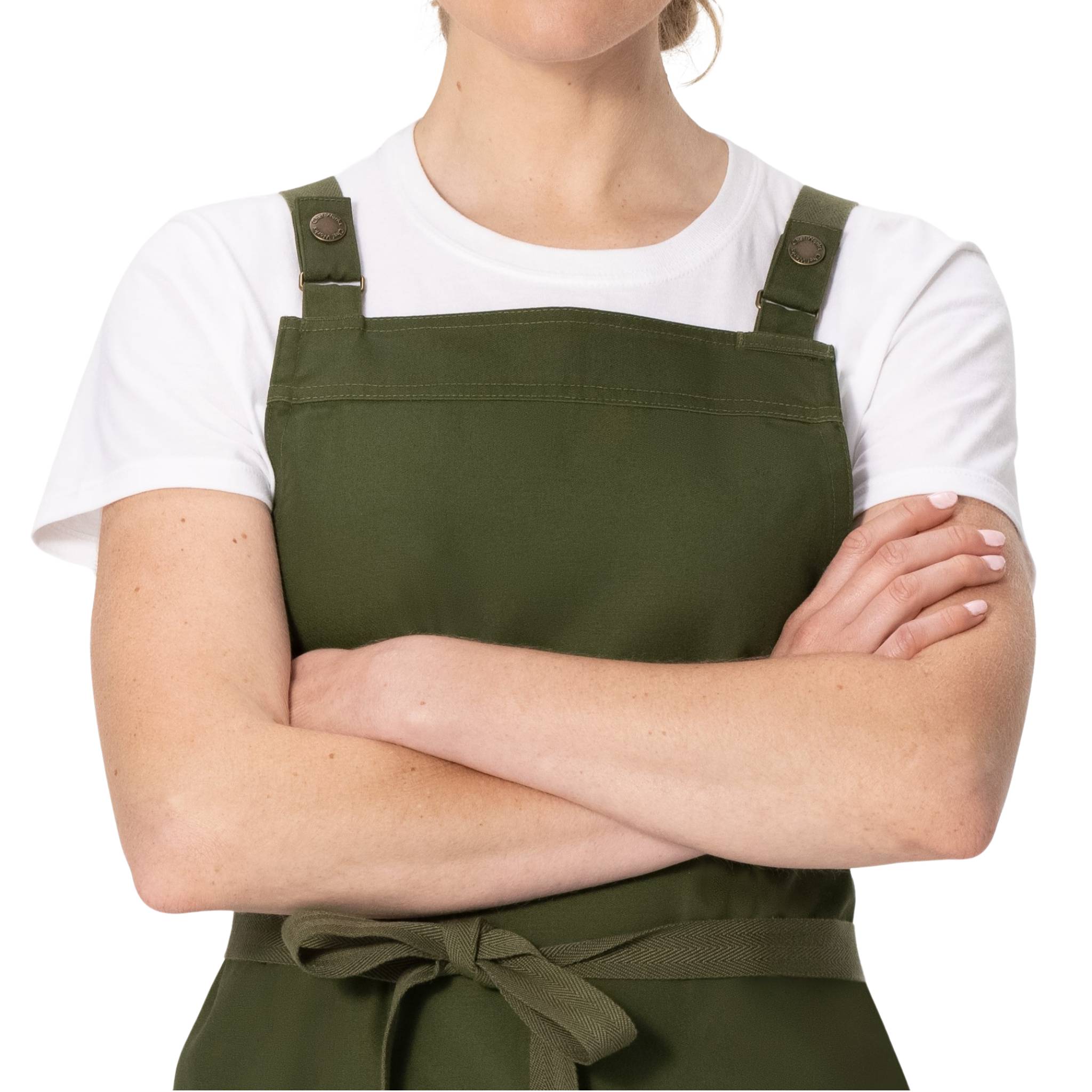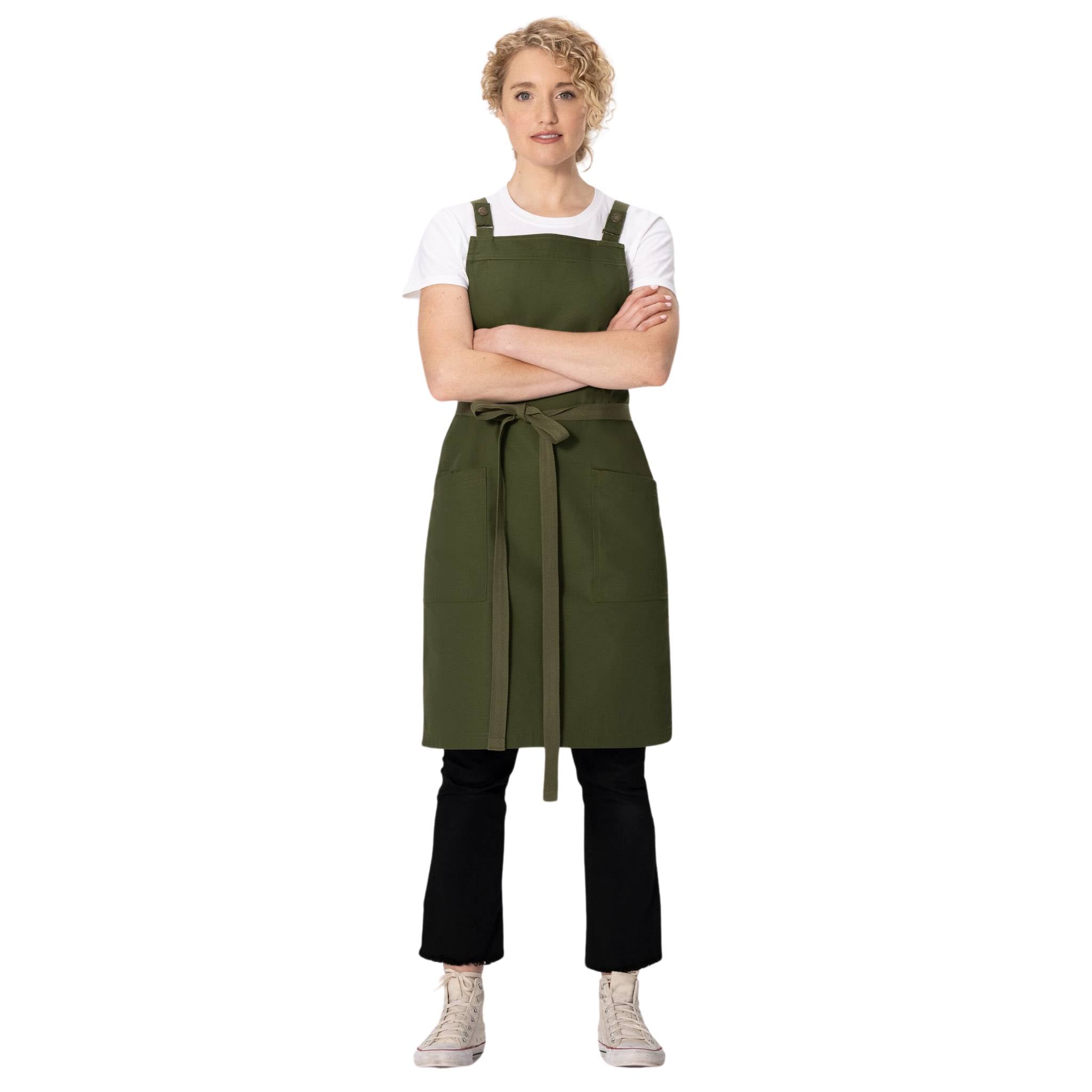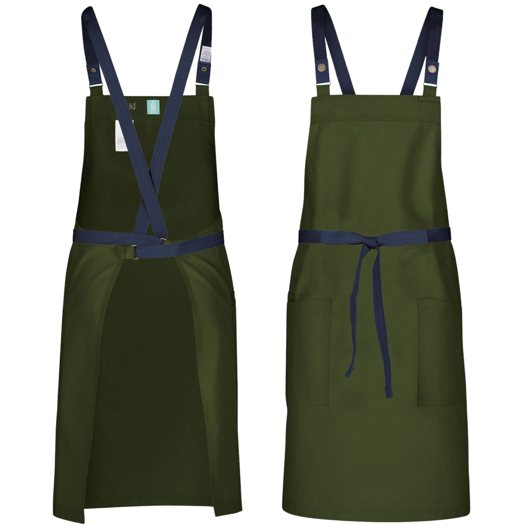 店舗演出やスタッフの好みに合わせてカスタマイズ可能な「ロックハート」エプロン。Chef Worksが開発した特別なサスティナブルキャンバス生地を使用。丈夫さとラフな質感がお洒落なキャンバス生地を、ペットボトルからリサイクルされたポリエステル繊維と綿で構成。キャンバス生地の特性はそのままに、サスティナブルなエプロンに仕上がりました。ポリエステル繊維を配合している事で耐久性、シワのつきづらさ、乾きの早さにも優れ、毎日の着用と洗濯を繰り返す飲食店での使用に最適です。タブレットを収納可能な大きめサイズのポケットが左右ヒップに1つずつ、右ポケットにはペン・小物挿し付きでとっても便利。左胸ストラップの付け根にはユーティリティループ(同生地のベルトループ)を備え、ペン挿しとしての使用はもちろん、カラビナを使ってお洒落に小物を携帯する事も可能です。豊富なカラーバリエーションに加え、好みのストラップスタイル・カラーを選択出来る点も魅力。安定した着用感で首の疲労を軽減する「クロスバックストラップ」と、すっきりとスタイリッシュな印象に仕上がる「ネック&ウエストストラップ」をご用意しています。レストランやカフェ、居酒屋などの飲食店はもちろん、お花屋さんや床屋さんにいたるまで、丈夫でお洒落なこのエプロンが様々なシチュエーションで活躍するはず。さぁ、みなさんのお店にぴったりなカラーコンビネーションにカスタマイズしましょう。