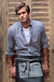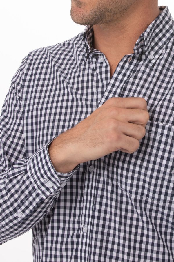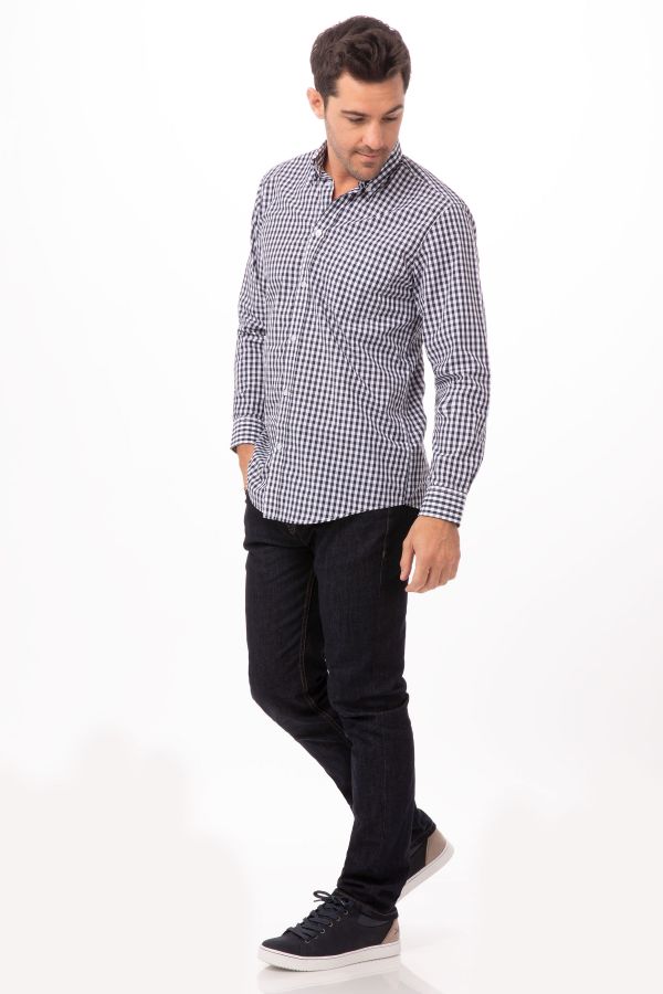 柔らかい平織りの生地を使っているネイビーのギンガムチェック。ボタンダウンのカラーに、カフスにもボタン2つ、左胸ポケット付き、背中真ん中にプリーツが入り、肩が動かしやすいスタイルです。合わせるエプロンの雰囲気でかっこよくも可愛いくもなるシャツです。色はネイビーの他にもレッドとブラックがあり。お店で3色混ぜて使ってもいいですね。