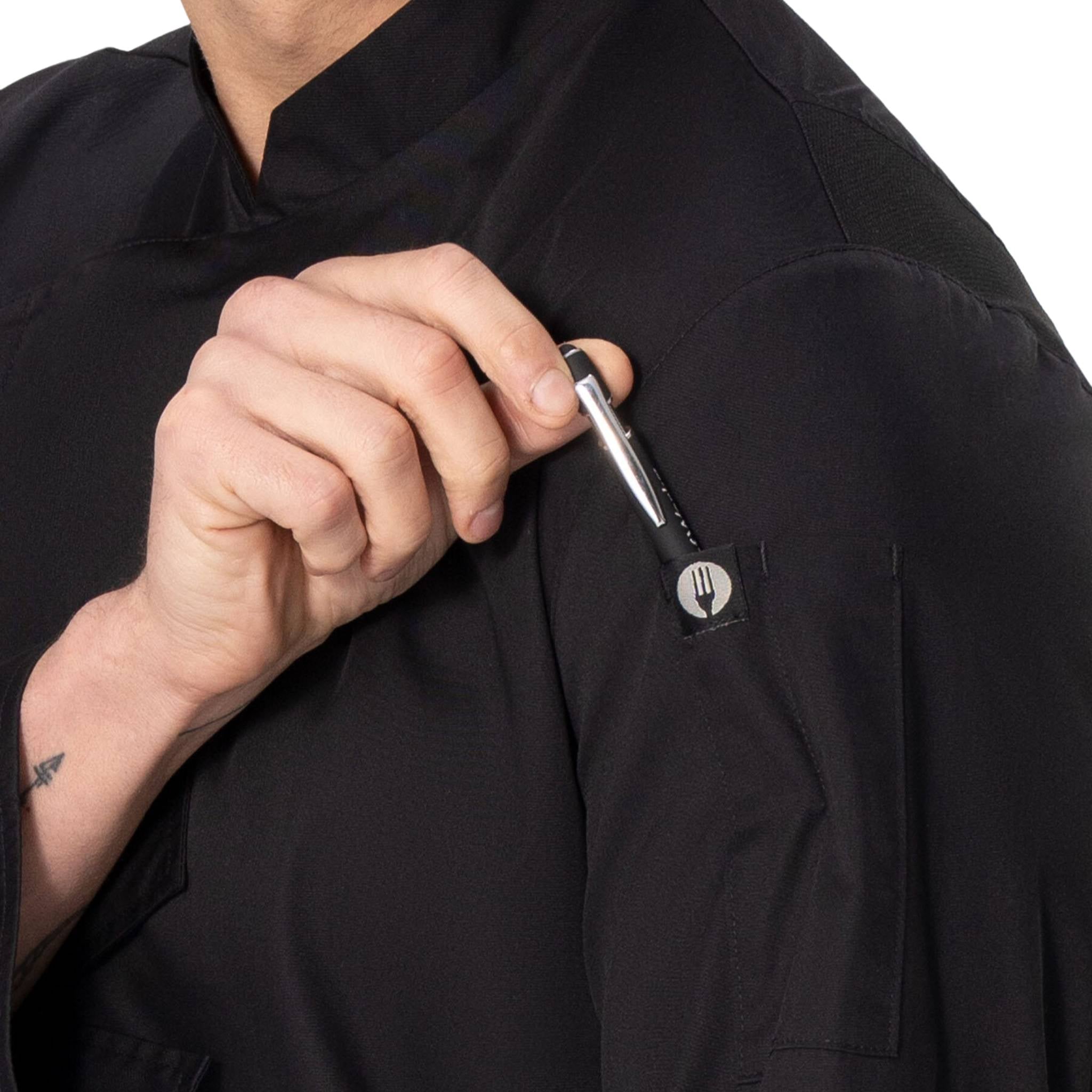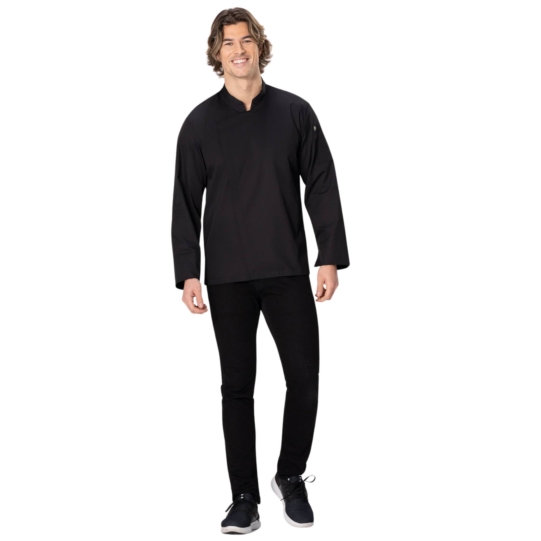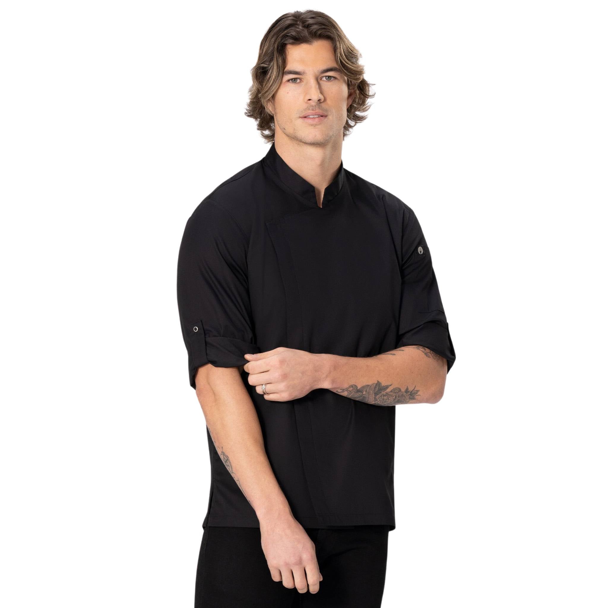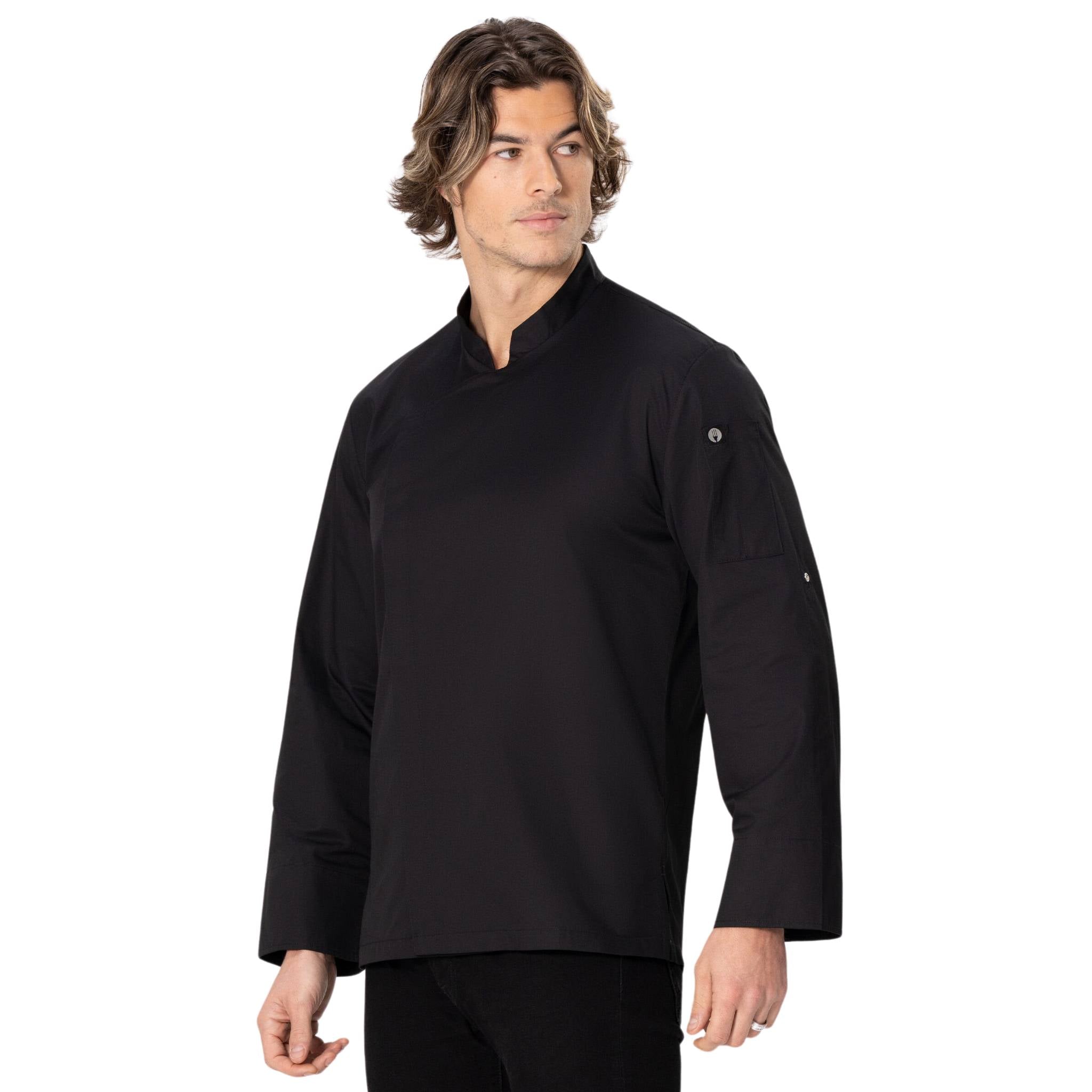 すっきりとシャープな印象を与える「ランジング」コックコート。軽くて丈夫な「Lite」生地を採用し、軽快な着心地はもちろん、乾きも早くメンテナンスが簡単な点も特徴です。またボディー背面の両サイドには、通気性と伸縮性に優れる「Cool Vent」生地を採用。コックコート内の蒸れを防ぎながら肩回りの動きやすさにも貢献し、暑く忙しいキッチンでの作業を快適にサポートします。袖内部には袖留め用のスナップボタン付きタブを備えており、ロールアップした袖もスタイリッシュに留めておくことが可能。左腕には便利なペン・温度計挿しポケットも搭載。エッジの効いた襟や胸元のデザインが、着用するシェフにシャープで洗練された印象を与えるのと同時に、エアリーで快適な着心地を提供します。メンズ・レディースそれぞれ3色をご用意。レストランやカフェ、ペストリーなど、シャープで洗練された雰囲気を演出したいお店にぴったりのランシング。快適な着心地を皆さんのお店で体験してく