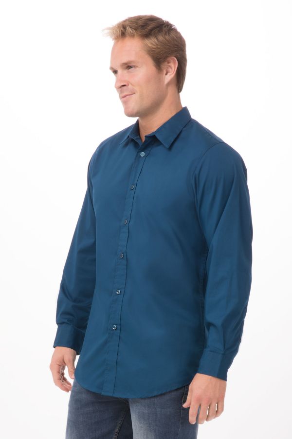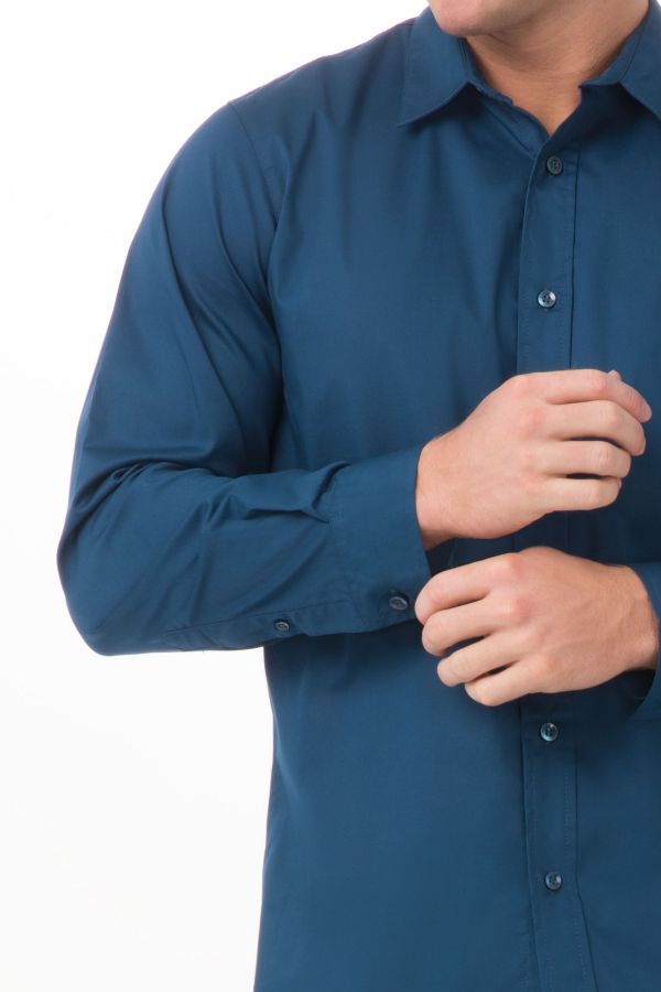 深みのあるブルーカラーが特徴の長袖シャツ。生地にはポリウレタン繊維を含ませ、わずかにストレッチが効く仕様となっている為、ハードワークも快適にこなせます。2つの袖口幅調節用ボタン付きで、デザイン性だけでなく、機能性も抜群です。レディースもあり。