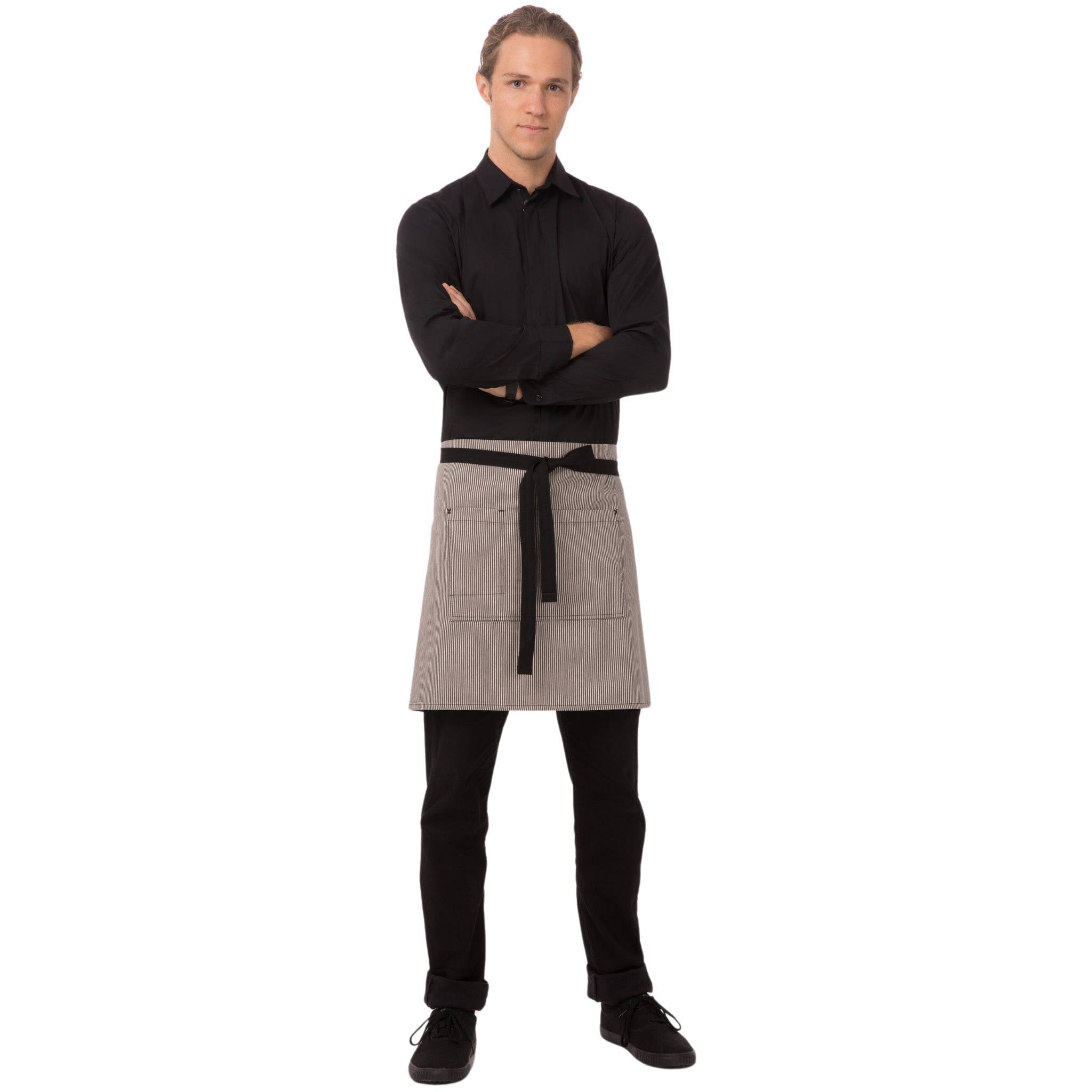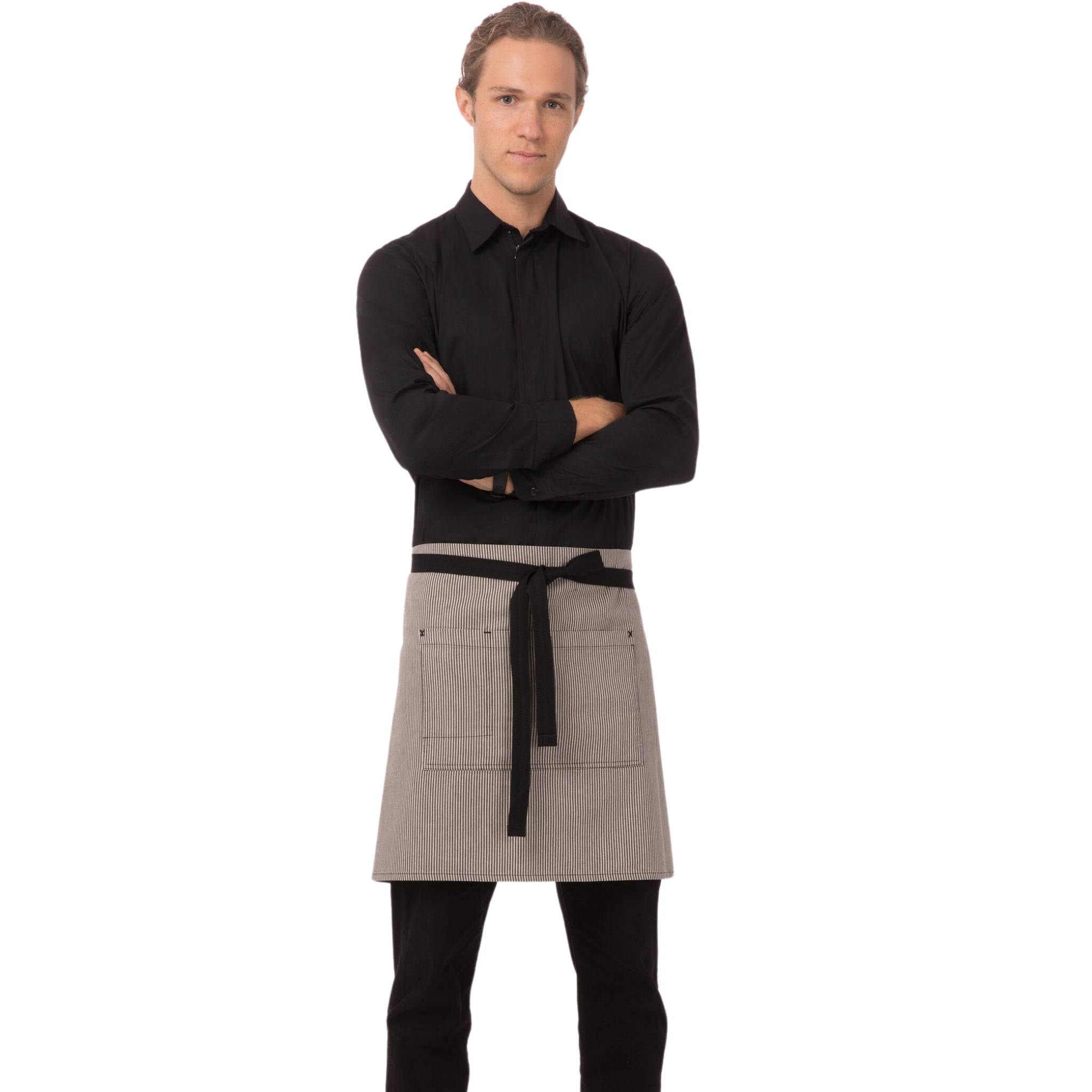 ストライプ柄がお洒落なヒッコリーデニムを採用した「ポートランド」エプロンシリーズ。ミドルサロンは、すっきりとした見た目と快適さを極めたフロアスタッフに最適な一枚。大きめの前ポケットは携帯電話用の間仕切り付き。綿を多く使用したデニムならではの丈夫さとナチュラルな質感に、少量のポリエステル混紡による洗濯のし易さも長く支持されているポイントです。カフェやレストラン、ベーカリーなど様々な店舗の雰囲気をお洒落なカジュアルテイストに仕上げてくれます。