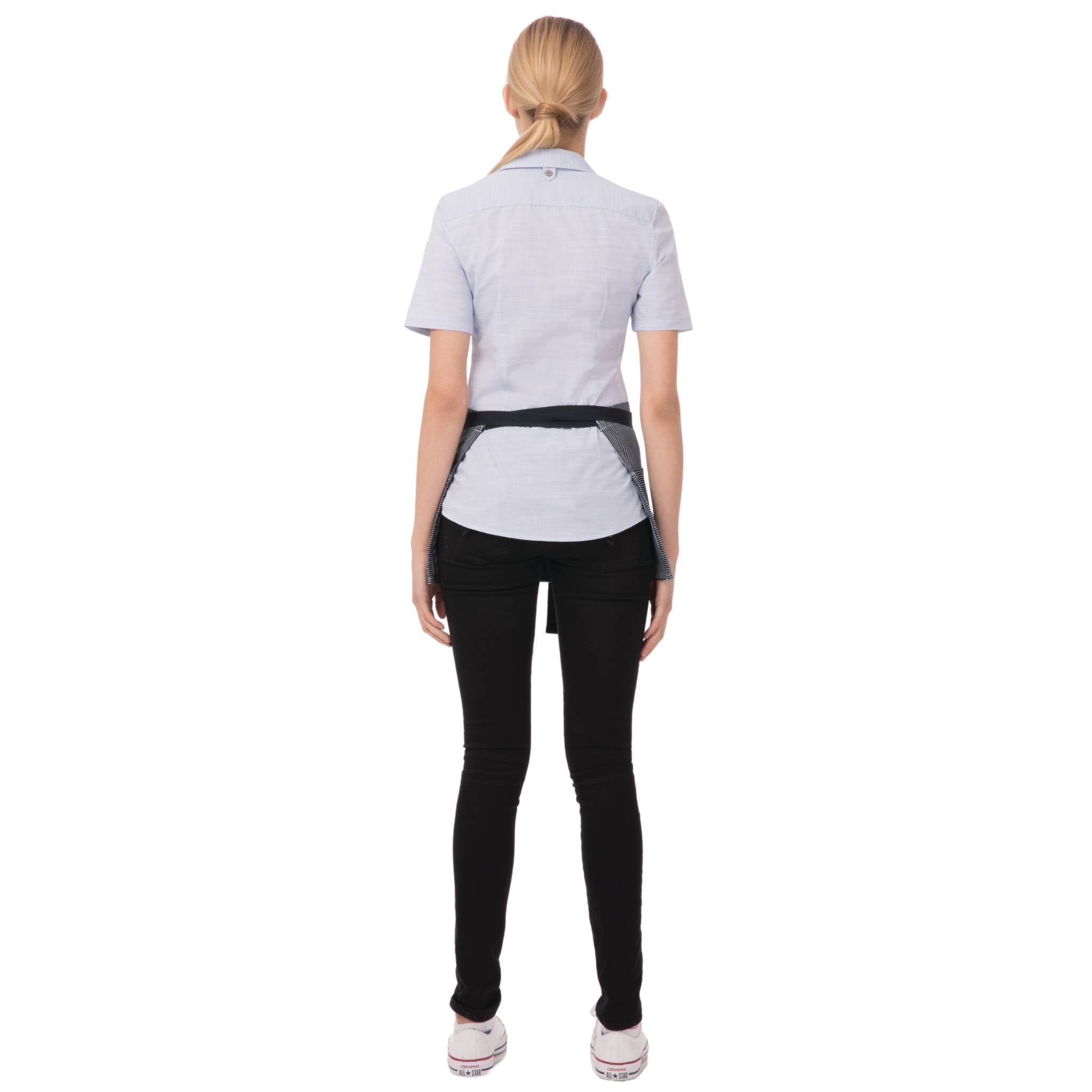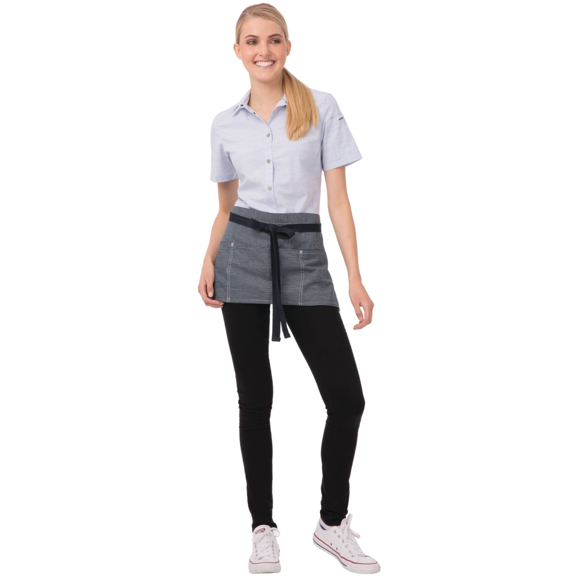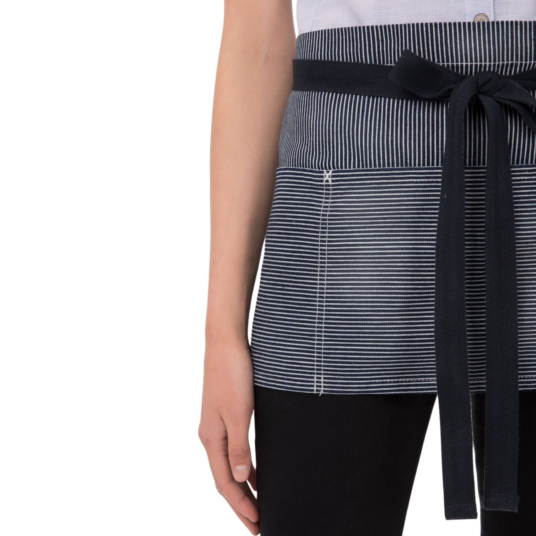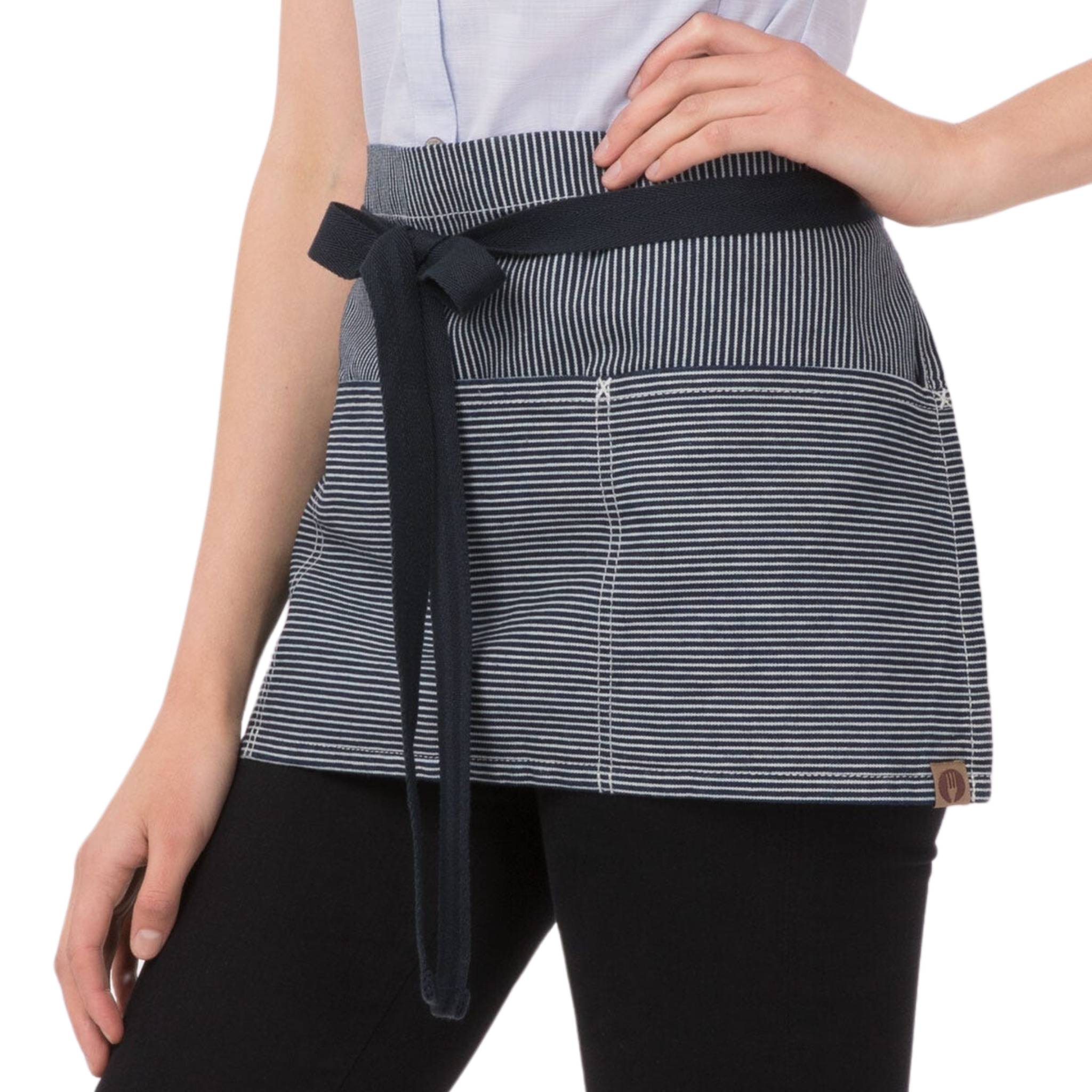 ストライプ柄がお洒落なヒッコリーデニムを採用した「ポートランド」エプロンシリーズ。アクティブな印象を与えるショートサロンは、動きやすさと使いやすさを極めたフロアスタッフに最適な一枚。大きめの前ポケットは携帯電話用の間仕切り付き。綿を多く使用したデニムならではの丈夫さとナチュラルな質感に、少量のポリエステル混紡による洗濯のし易さも長く支持されているポイントです。カフェやレストラン、ベーカリーなど様々な店舗の雰囲気をお洒落なカジュアルテイストに仕上げてくれます。