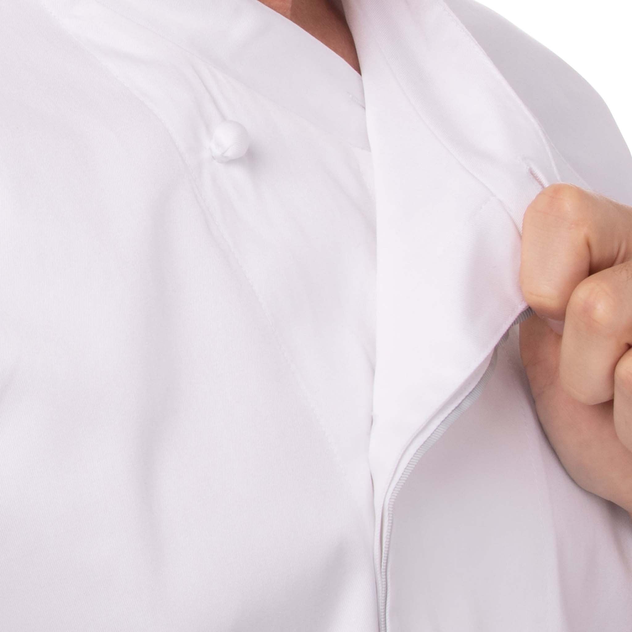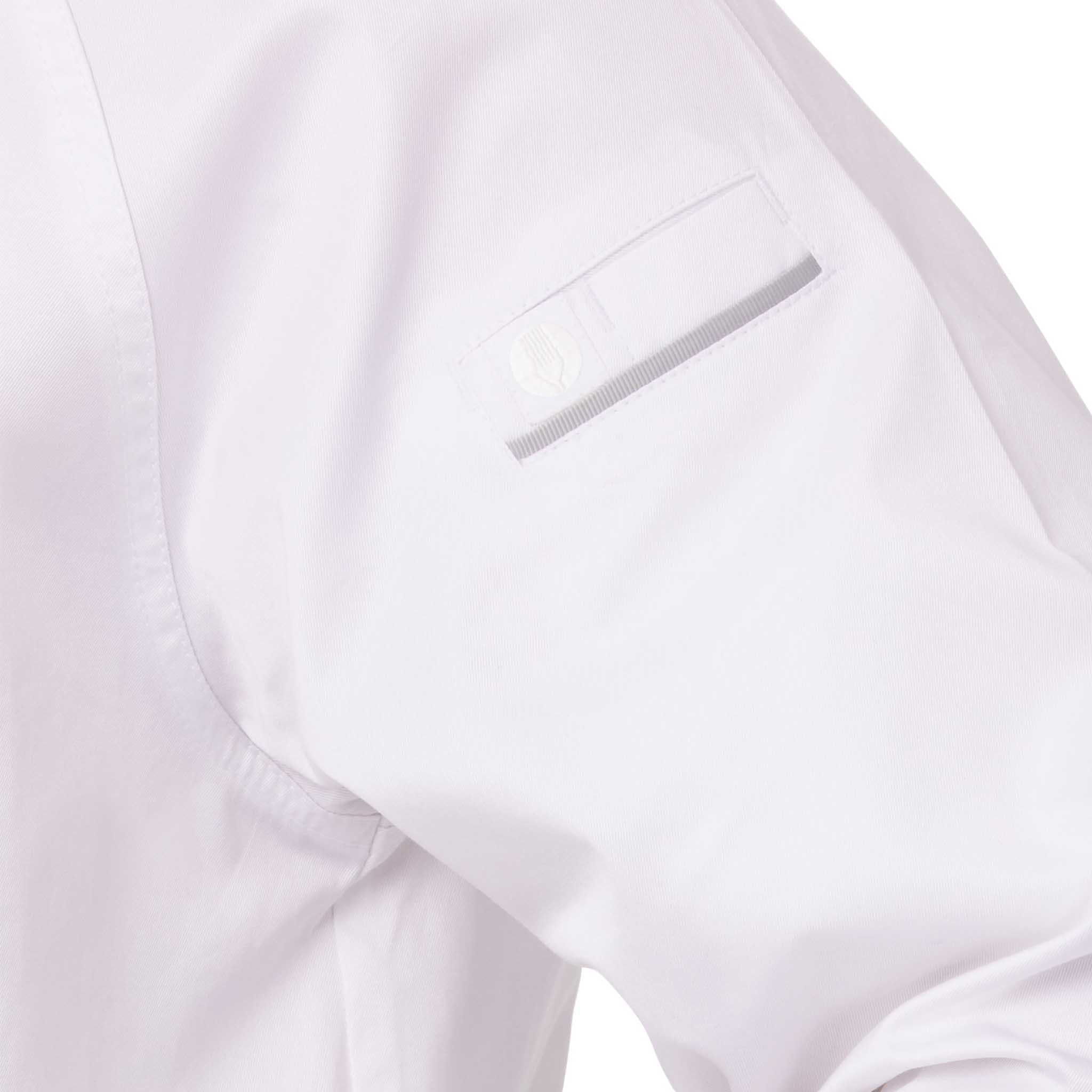 トリエスタプレミアムコットンシェフコートは、軽量タイプの耐久性に富んだ、プレミアムコットン100%の長袖。シルキーな手触りの生地に、手くるみボタン1つだけを表に出し、他のボタンは裏地に、フレンチカフス、グレ-のパイピング入りで、上質高い、エレガントな仕上がりの一枚。左腕に温度計ポケットあり。手摘みで採った綿からさらに良質なものだけを選んで織ったプレミアムユニフォームです。シンプルでスタイリッシュ見え、且つ動きやすさにこだわったパターン(型)のシェフジャケット。動きやすいゆったりめのフィット感。13サイズ展開あり。ホワイトのみ。