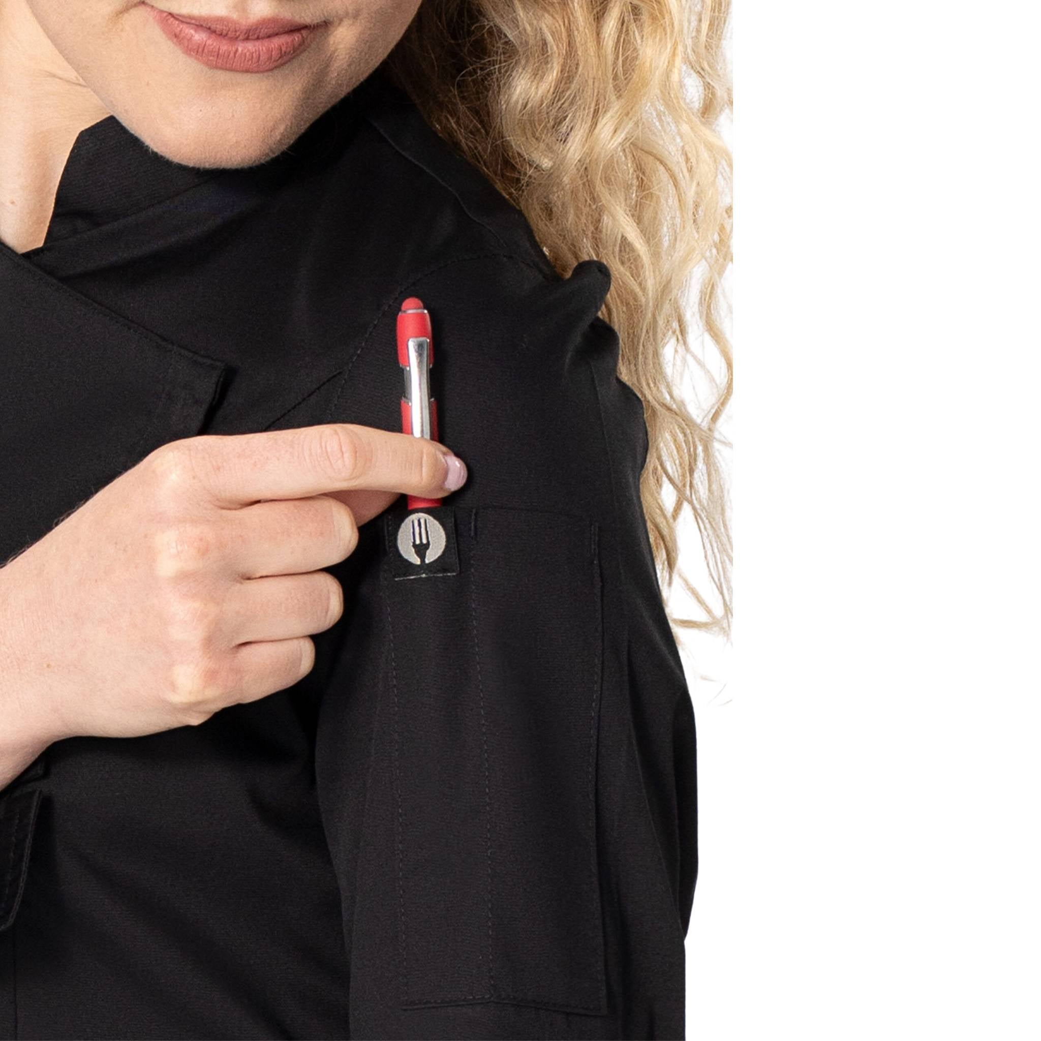 すっきりとシャープな印象を与える「ランジング」コックコート。軽くて丈夫な「Lite」生地を採用し、軽快な着心地はもちろん、乾きも早くメンテナンスが簡単な点も特徴です。レディースコックコートはプリンセスラインでのパネル切り替えを行いより立体的に仕立てる事で、体に沿う綺麗なシルエットと着心地の良さを生み出しています。またボディー背面の両サイドには、通気性と伸縮性に優れる「Cool Vent」生地を採用。コックコート内の蒸れを防ぎながら肩回りの動きやすさにも貢献し、暑く忙しいキッチンでの作業を快適にサポートします。袖内部には袖留め用のスナップボタン付きタブを備えており、ロールアップした袖もスタイリッシュに留めておくことが可能。左腕には便利なペン・温度計挿しポケットも搭載。エッジの効いた襟や胸元のデザインが、着用するシェフにシャープで洗練された印象を与えるのと同時に、エアリーで快適な着心地を提供します。メンズ・レディースそれぞれ3色をご用意。レストランやカフェ、ペストリーなど、シャープで洗練された雰囲気を演出したいお店にぴったりのランシング。快適な着心地を皆さんのお店で体験してください。